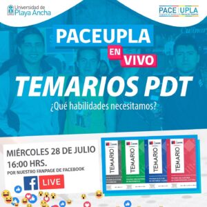 La Universidad de Playa Ancha a través del Programa de Acceso a la Educación Superior (PACE) 2021 y de su componente de Preparación en la Enseñanza Media (PEM), te invita a participar el miércoles 28 de julio, a las 16 horas, en su segunda sesión EN VIVO en la cual abordarán los «Temarios PDT: ¿Qué habilidades necesitamos?»