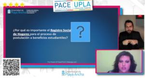 Con el objetivo de asegurar el acceso a la información de los asistentes a la actividad que pudieran presentar discapacidad auditiva y garantizar su plena participación en ella, el PEM PACE-UPLA incorporó al intérprete de lengua de señas, Gerson Jara, quien estará de forma permanente en las transmisiones En Vivo.