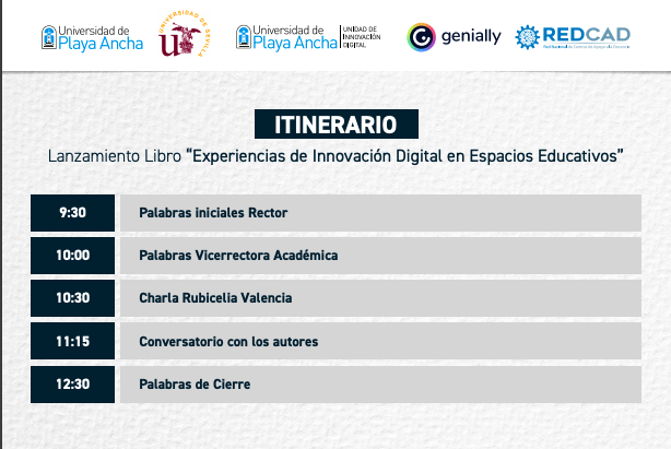 El prólogo del libro se encuentra a cargo del doctor Julio Cabero, de la Universidad de Sevilla, y de la doctora Rubicelia Valencia. También cuenta con la participación de los ponentes del “Seminario Internacional de Innovación Digital en Espacios Educativos”, celebrado en la Universidad de Playa Ancha en enero del presente año: José Miguel Correa, Daniela Geli, Luis Dávila, Javier Prada, Ruth Toro y Claudio Saavedra.