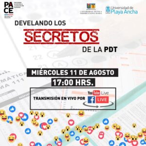 Con el objetivo de acercar a los estudiantes de tercero y cuarto medio las Pruebas de Transición a la Educación Superior tanto obligatorias como específicas, correspondientes al proceso de Admisión 2022, las universidades de Playa Ancha (UPLA) y Técnica Federico Santa María (USM) a través de sus Programas de Acceso a la Educación Superior, PACE, invitan a la sesión En Vivo “Develando los secretos de la PDT”.
