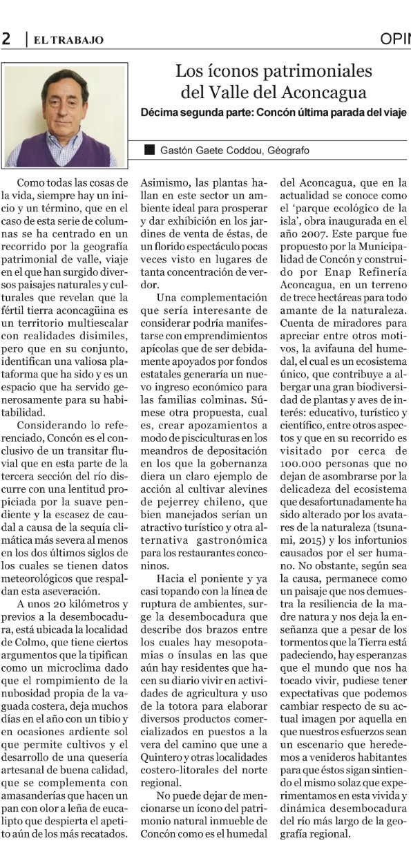 «Como todas las cosas de la vida siempre hay un inicio y un término, que en el caso de esta serie de columnas se han centrado en un recorrido por la geografía patrimonial de valle. Viaje en el que han surgido diversos paisajes naturales y culturales que revelan que la fértil tierra aconcagüina es un territorio multiescalar con realidades disímiles, pero que en su conjunto, identifican una valiosa plataforma que ha sido y es un espacio que ha servido generosamente para su habitabilidad.
