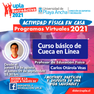 Con pañuelo en mano, la DIDER programó un “Curso básico de cueca en línea”, que se realizará desde el jueves 19 de agosto al jueves 9 de septiembre, a las 18:30 horas, por Facebook Deportes y Recreación UPLA, y lo impartirá el profesor de Educación Física y coordinador de Deportes y Recreación del campus San Felipe, Carlos Otárola Veas.