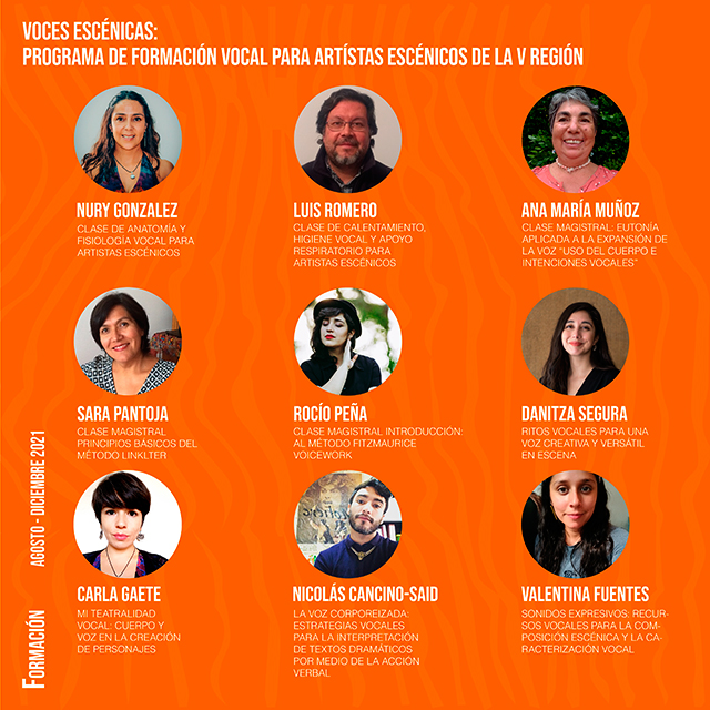 Valentina Fuentes, coordinadora del programa de formación vocal, explicó que esta iniciativa está dirigida a la comunidad artística escénica de la Región de Valparaíso interesada en el aprendizaje, desarrollo, promoción y transmisión profesional en el área de la voz. Para ello -dijo- se contará con profesionales de los campos de la fonoaudiología, canto, teatro y de diversas técnicas de conciencia corporal/vocal.