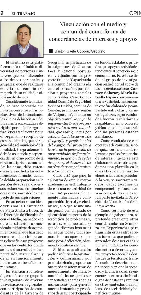 Este año con un grupo de investigadores de diversas universidades regionales con participación de estudiantes de la carrera de Geografía, en particular, de la asignatura de Gestión Local y Regional postularon y adjudicaron un proyecto titulado “Capacitando a la comunidad organizada en la elaboración y postulación a proyectos sociales concursables. Caso: Comunidad Comité de Seguridad Vecinos Unidos, comuna de Concón, provincia y región de Valparaíso” siendo su objetivo central “apoyar la implementación de proyectos sociales en una comunidad, que sean guiados por estudiantes de la carrera de Geografía y profesionales del equipo del proyecto a través de la generación de oportunidades de financiamiento, la gestión de redes de apoyo y el desarrollo de un plan de acompañamiento y formación”.