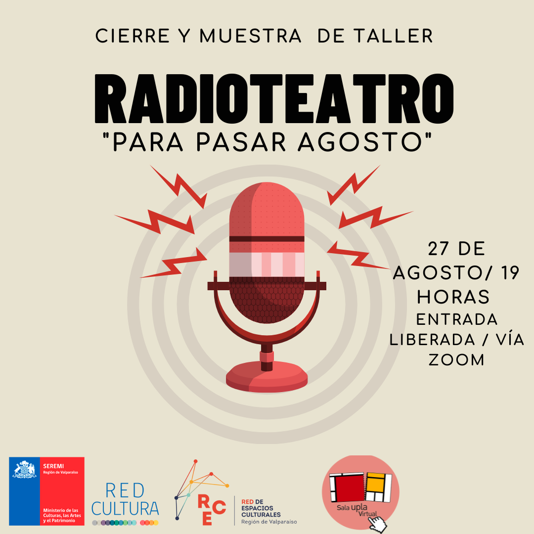 El próximo viernes 27 de agosto a las 19 horas Sala UPLA realizará la muestra de siete microrrelatos en formato radial creados durante el taller de radioteatro denominado “Para pasar agosto”, el cual contó con el apoyo del programa Red Cultura de la Seremi de las Culturas, las Artes y el Patrimonio, Región de Valparaíso.