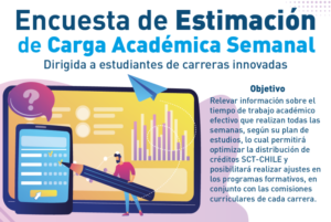 La Dirección General de Pregrado, dependiente de la Vicerrectoría Académica, informó que entre el 6 y 30 de septiembre estará disponible en el Sistema Integrado Institucional (SINTE), la Encuesta de Estimación de Carga Académica Semanal (correspondiente al primer semestre de 2021), la cual se encuentra dirigida a estudiantes pertenecientes a carreras innovadas curricularmente y adscritas al Sistema de Créditos Transferibles (SCT- CHILE).