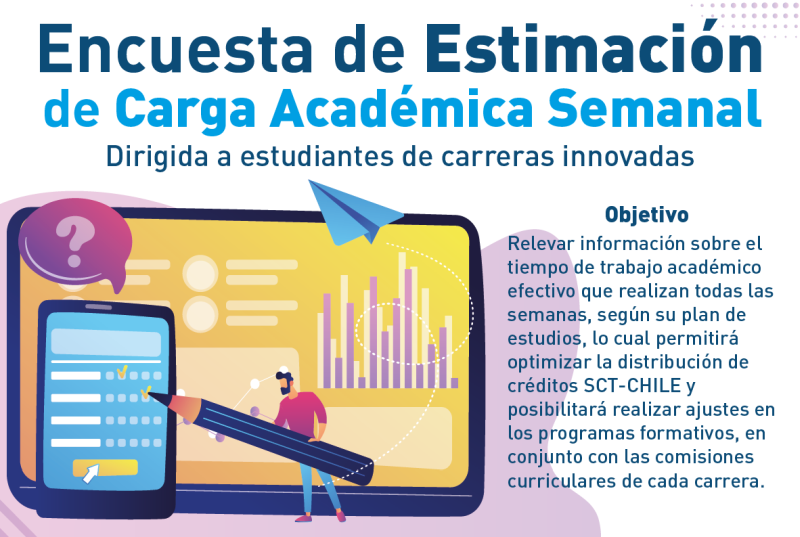 La Dirección General de Pregrado, dependiente de la Vicerrectoría Académica, informó que entre el 6 y 30 de septiembre estará disponible en el Sistema Integrado Institucional (SINTE), la Encuesta de Estimación de Carga Académica Semanal (correspondiente al primer semestre de 2021), la cual se encuentra dirigida a estudiantes pertenecientes a carreras innovadas curricularmente y adscritas al Sistema de Créditos Transferibles (SCT- CHILE).