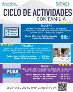 El Programa de Acceso a la Educación, PACE, de la Universidad de Playa Ancha, que este año acompaña en su tránsito a la educación superior a estudiantes de tercero y cuarto medio de 20 establecimientos municipales de la región de Valparaíso y de 3 de la región de Coquimbo, realizó el 3 y 6 de septiembre el primer taller para apoderados y alumnos como parte del «Ciclo de actividades con familia».