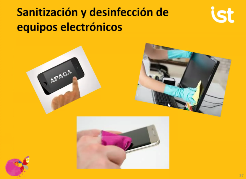 El taller “Limpieza y sanitización de espacios de trabajo” estuvo a cargo de Constanza Pino Rodríguez, asistente de Prevención de Riesgos del Instituto de Seguridad del Trabajo (IST), quien entregó información sobre aspectos como aseo y sanitización, uso de desinfectantes, exigencias del Instituto de Salud Pública y otros.