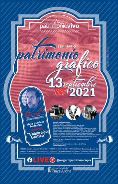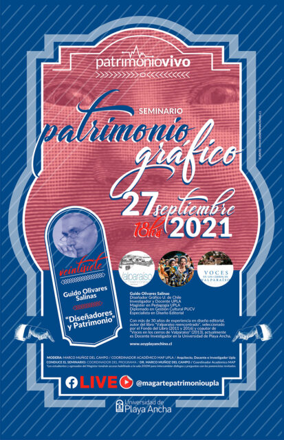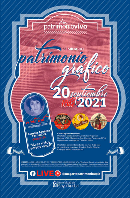 Todos los lunes (18:00 horas) de septiembre la carrera de Diseño de la Facultad de Arte y el Magíster en Arte, mención Patrimonio de la UPLA, desarrollarán el ciclo de charlas denominado “Seminario Patrimonio Grafico”, instancia que considera la participación de profesionales del área como Claudia Aguilera (UPLA), Pedro Álvarez Caselli, Ernesto Iturrieta y Guido Olivares (UPLA).