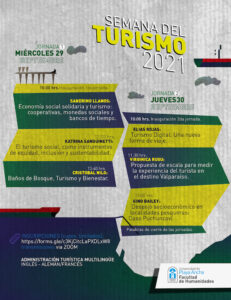 La jornada del Miércoles 29 de septiembre abrirá con la participación de Sandrino Llanos, miembro de la Sociedad de Investigadores de Turismo de Chile SOCIETUR, quien además es un profesional orientado a los temas de gestión sustentable de destinos, diseño de productos y la relación entre el turismo y patrimonio. Llanos expondrá sobre la economía social solidaria y turismo: cooperativas, monedas sociales y bancos de tiempo. Luego se presentará la académica Katrina Sanguinetti, quien se referirá al turismo social como instrumentos de equidad, inclusión y sustentabilidad. Cerrará la jornada el tesista Cristóbal Nilo, con la charla “Baños de Bosque, Turismo y Bienestar”, en la cual propondrá el uso de una nueva experiencia turística y recomendaciones sobre una empresa local de Valparaíso que desarrolla turismo de intereses especiales en la comuna.