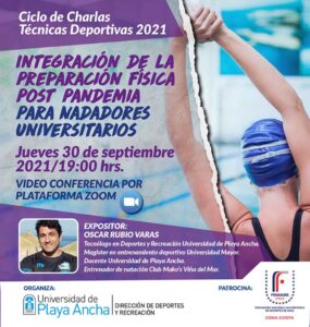 En esta cuarta charla el docente de la Universidad de Playa Ancha, Oscar Rubio Varas, tecnólogo en Deportes y Recreación por esta casa de estudios y magíster en Entrenamiento Deportivo por la Universidad Mayor, se referirá a la «Integración de la preparación física post pandemia para nadadores universitarios«.