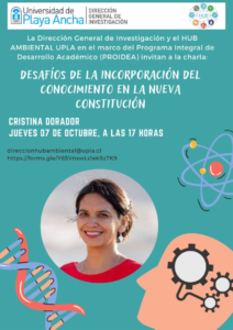 La Dirección General de Investigación y el Centro de Investigación HUB Ambiental de la Universidad de Playa Ancha invitan a participar en la charla «Desafíos de la incorporación del conocimiento en la Nueva Constitución», que impartirá la convencional constituyente por la región de Antofagasta, Cristina Dorador, científica, doctora e investigadora experta en microbiología, ecología microbiana, limnología y geomicrobiología.