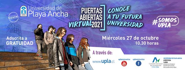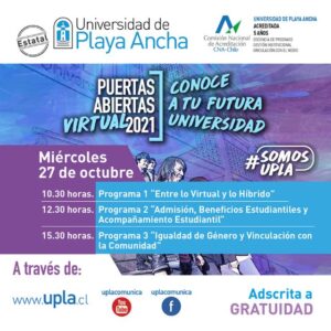 Por segundo año consecutivo la Universidad de Playa Ancha realizará su jornada de Puertas Abiertas 2021 en modalidad virtual, actividad orientada a estudiantes de enseñanza media del país y futuros postulantes con el objetivo de informar sobre la formación profesional para la participación en un nuevo mundo digital, el acompañamiento que la institución brinda a los estudiantes en sus trayectorias académicas, así como las vías de ingreso y beneficios estudiantiles, entre otros temas.