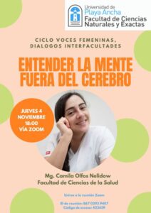 Una nueva charla se realizará el jueves 4 de noviembre, a las 18 horas, en el marco de ciclo “Voces femeninas, diálogos interfacultades”, que desarrolla la Coordinación de Vinculación con el Medio de la Facultad de Ciencias Naturales y Exactas , por la plataforma Zoom