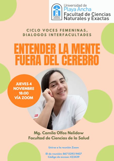 En esta oportunidad expondrá la terapeuta ocupacional de la Facultad de Ciencias de la Salud, Mg. Camila Olfos Nelidow, quien expondrá sobre “Entender la mente fuera del cerebro”.
