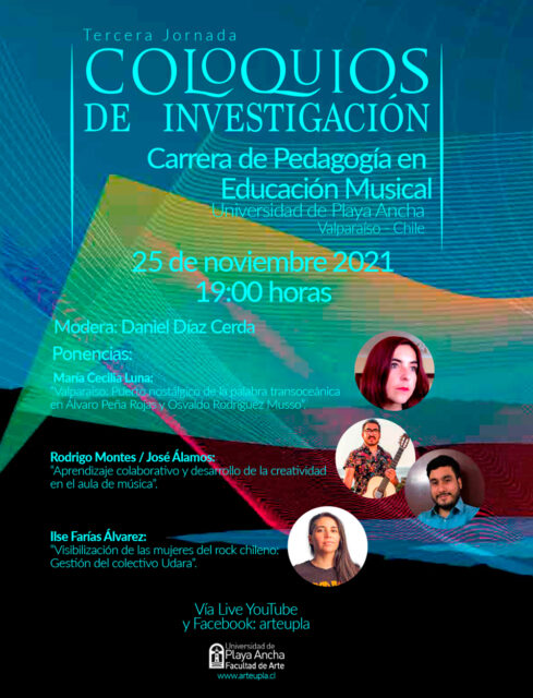 El jueves 25 de noviembre (19:00 horas) se realizará la tercera y última jornada de “Coloquios de investigación de la carrera de Pedagogía en Educación Musical UPLA”, espacio de conversación dirigido a la reflexión colectiva de las músicas de Chile y Latinoamérica, así como ayudar a entender las didácticas específicas de la disciplina y a facilitar las formas de cómo se transmite el conocimiento.