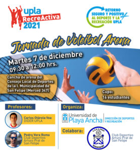 La actividad, que se efectuará en la cancha de arena del Consejo Local de Deportes de la municipalidad de San Felipe, ubicada en Merced 347, forma parte de las actividades programadas por la DIDER UPLA para un retorno seguro y positivo al deporte y la recreación.
