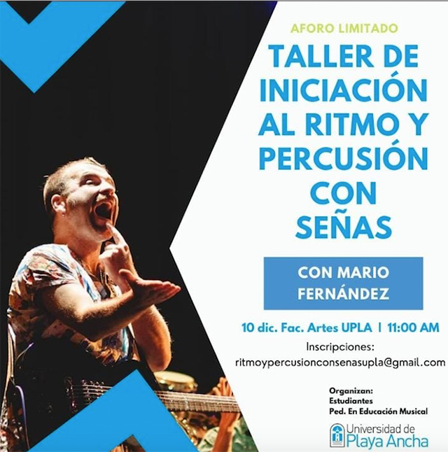 La iniciativa, organizada por Thaís Olivera, Adam Bustíos y Manuel Iturrieta, estudiantes de la asignatura Elaboración de Proyectos Artísticos que dicta el docente Antil Camacho, promueve y propone nuevos lenguajes y juegos musicales como procesos de enseñanza basados en el innovador método “Ritmo y Percusión con Señas” desarrollado por el músico argentino Santiago Vásquez.