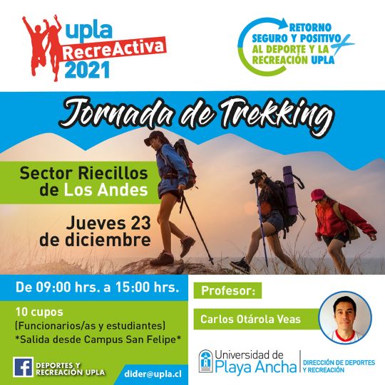 La Dirección de Deportes y Recreación, dependiente de la Dirección General de Desarrollo Estudiantil, en el marco del «Plan de Retorno Seguro y Positivo a las Actividades Deportivas y Recreativas presenciales», invita a la comunidad de la sede San Felipe a participar en la Jornada de Trekking, a realizarse el jueves 23 de diciembre, de 9:00 a 15:00 horas en el sector «Riecillos de Los Andes».