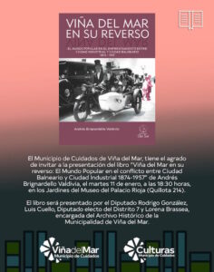 Con la participación de la jefa del Archivo Municipal, Lorena Brassea, el diputado Rodrigo González y el diputado electo Luis Cuello, se realizó la presentación del libro “Viña del Mar en su Reverso: Una Mirada al Mundo Popular en el Conflicto entre Ciudad Balneario y Ciudad Industrial” del escritor, historiador viñamarino y académico del magíster de Gestión Cultural de la Universidad de Playa Ancha, Andrés Brignardello Valdivia.