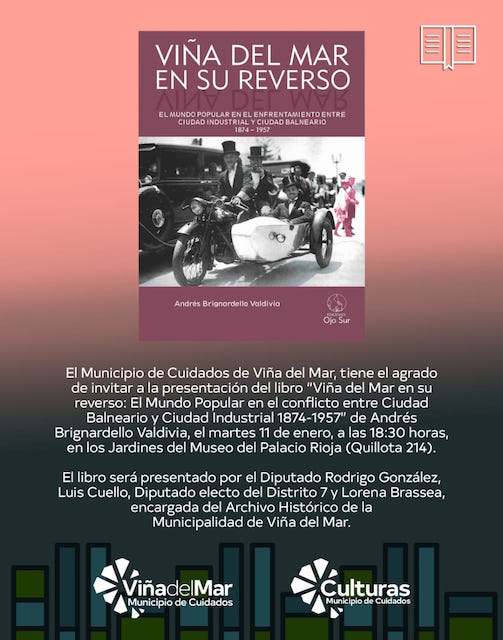 Con la participación de la jefa del Archivo Municipal, Lorena Brassea, el diputado Rodrigo González y el diputado electo Luis Cuello, se realizó la presentación del libro “Viña del Mar en su Reverso: Una Mirada al Mundo Popular en el Conflicto entre Ciudad Balneario y Ciudad Industrial” del escritor, historiador viñamarino y académico del magíster de Gestión Cultural de la Universidad de Playa Ancha, Andrés Brignardello Valdivia.