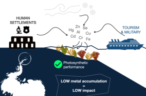 Con el objetivo de abordar las consecuencias de la presencia humana en dicho territorio polar, la especialista en ecología microbiana, Dra. Céline Lavergne, del Centro de Estudios Avanzados y del HUB Ambiental de la Universidad de Playa Ancha, lideró el más completo estudio hecho hasta ahora para diagnosticar los metales ambientales presentes en ecosistemas costeros polares, mediante biomonitoreo de macroalgas.