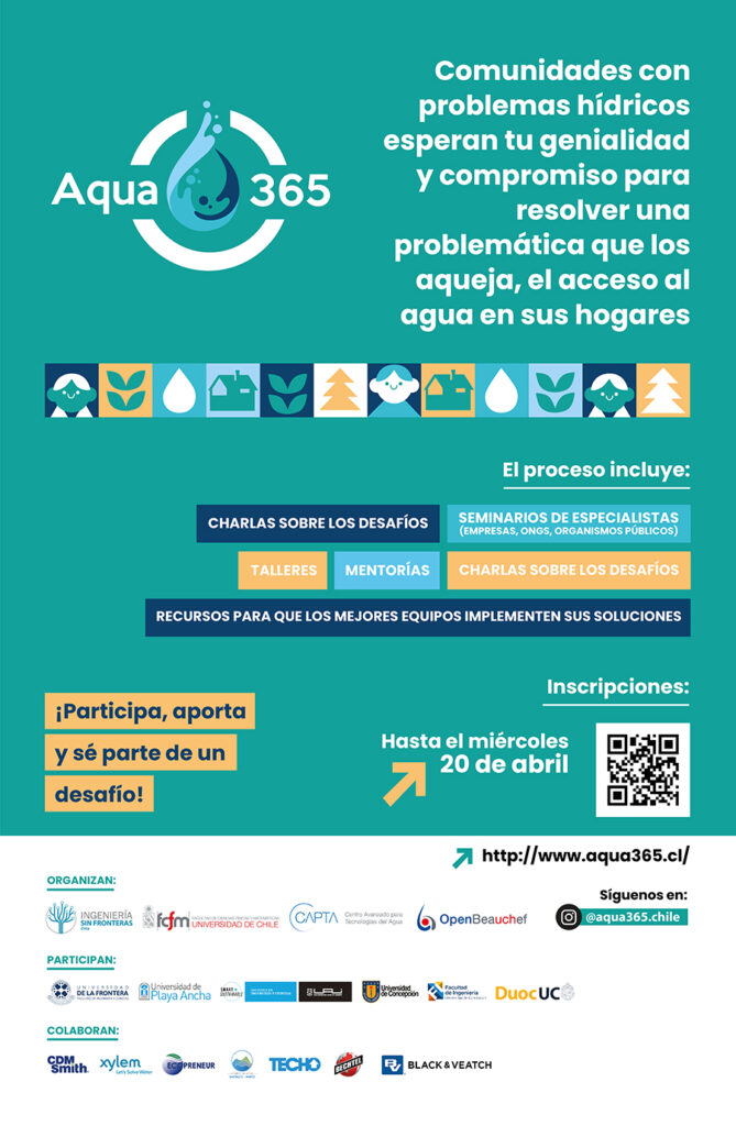 Aqua365 es un desafío de innovación para estudiantes de educación superior, que deben resolver y comprometerse con distintas problemáticas concretas con respecto al agua en comunidades de contexto de vulnerabilidad. El reto de este año es resolver -con ingenio y compromiso- el acceso al agua potable de dos comunidades específicas de la zona centro y sur de nuestro país. Para ello, ls participantes recibirán asesoramiento para preparar las postulaciones con metodologías de innovación de mentores del sector público y privado y docentes especialistas.