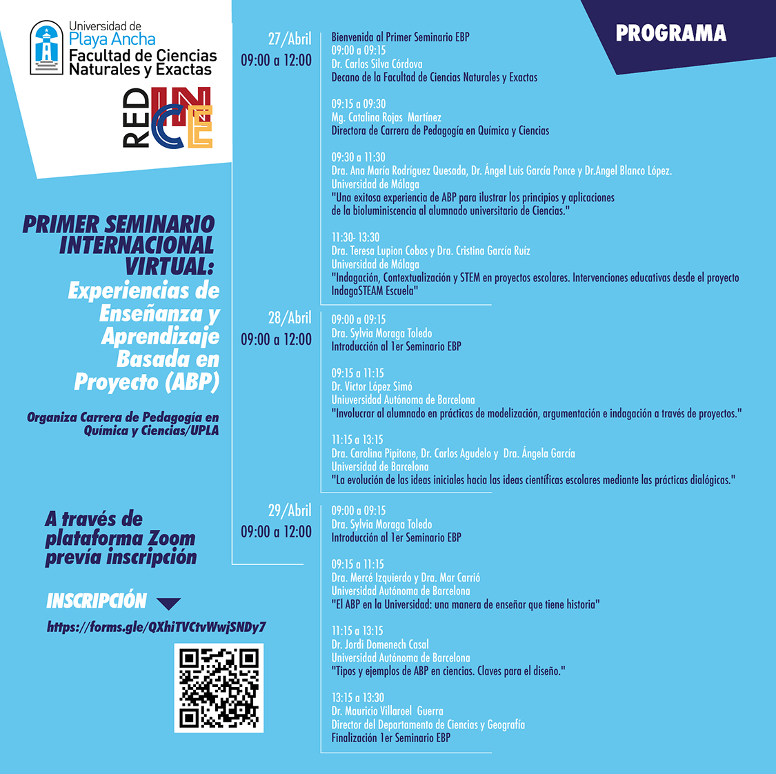 Con la temática “Experiencias de Enseñanza y Aprendizaje Basada en Proyecto (ABP)” la carrera de Pedagogía en Química y Ciencias de la Universidad de Playa Ancha efectuará entre el 27 y 29 de abril el Primer Seminario Internacional Virtual.