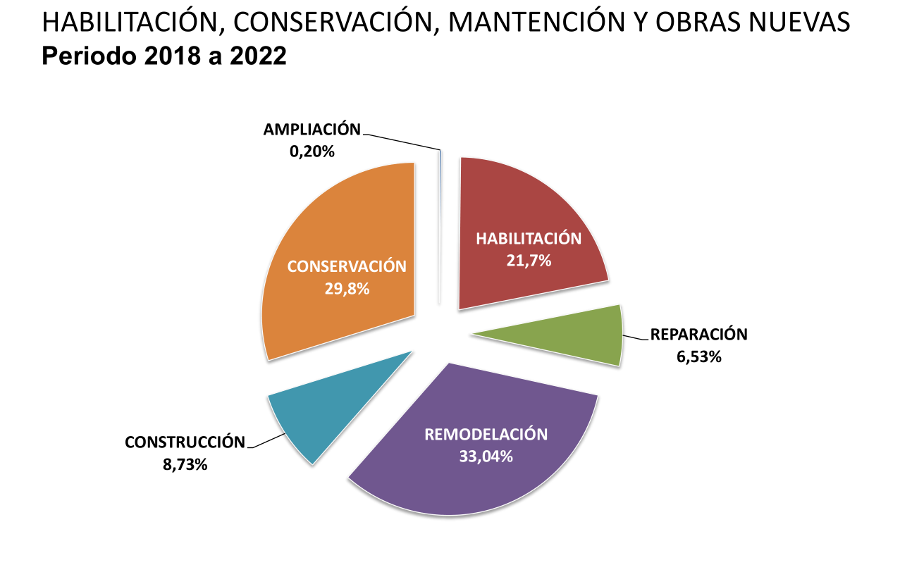 La otra base del crecimiento ya desarrollado y del que se planifica es la mantención de la infraestructura ya existente. Entre 2018 y 2022, casi un tercio del presupuesto de Infraestructura se destinó a la conservación y reparación de los inmuebles que ya tenía la universidad.