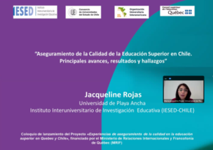 Como apoyo a estos objetivos, la investigadora de la UPLA y el IESED presentó durante el coloquio el estado del arte de la investigación sobre calidad de la educación, destacando el caso chileno. En el mismo panel, llamado “Aseguramiento de la Calidad de la Educación Superior en Québec y Chile. Principales avances, resultados y hallazgos”, la experiencia canadiense fue desarrollada por la Dra. Claude Mailhot, académica de la Universidad de Montreal.