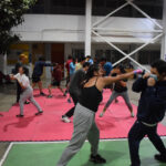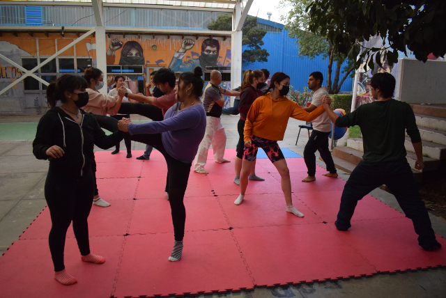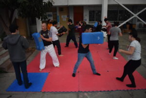 “Hemos trabajo movimientos básicos de pies, golpes con las zonas duras del cuerpo con rodillas, canillas y codos, por ejemplo. También hemos trabajado técnicas de espalda al piso para cuando alguien nos lleva al suelo, así como diferentes tipos de asfixia, palanca al hombro, al codo y cómo sacarme a alguien de encima”, explicó el monitor de Defensa Personal.