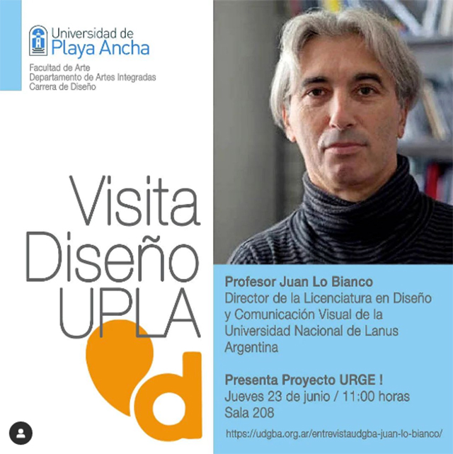 Dos actividades con estudiantes y docentes de la carrera de Diseño de la Facultad de Arte UPLA, sostendrá el director de la Licenciatura en Diseño y Comunicación Visual de la Universidad Nacional de Lanús (UNLa) de Buenos Aires, Juan Lo Bianco. Estas están fijadas para las 11:00 horas del jueves 23 y viernes 24 de junio en la Facultad de Arte (sala 208) y en el Museo Universitario del Grabado de Valparaíso, respectivamente.