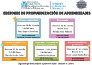 Las necesidades de profundización de las y los estudiantes de quinto semestre permitieron organizar cinco sesiones, las que realizaron durante el mes de junio. Entre los temas abordados se encontraron: Enfoques evaluativos, a cargo de la profesora Paola Esparza Gutiérrez; Anamnesis, a cargo de la profesora Marisela Vera Medinelli; Variables psicológicas del profesor, a cargo del psicólogo Marcelo Arraño Muñoz; Efectos de los fármacos en los procesos de aprendizajes, a cargo del profesor Claudio Berríos Bravo; y, Desarrollo de habilidades grafomotrices, a cargo de la profesora María Teresa Hidalgo Neira.