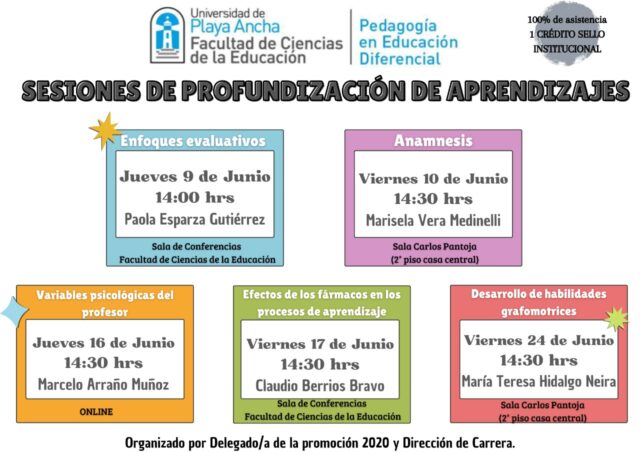 Las necesidades de profundización de las y los estudiantes de quinto semestre permitieron organizar cinco sesiones, las que realizaron durante el mes de junio. Entre los temas abordados se encontraron: Enfoques evaluativos, a cargo de la profesora Paola Esparza Gutiérrez; Anamnesis, a cargo de la profesora Marisela Vera Medinelli; Variables psicológicas del profesor, a cargo del psicólogo Marcelo Arraño Muñoz; Efectos de los fármacos en los procesos de aprendizajes, a cargo del profesor Claudio Berríos Bravo; y, Desarrollo de habilidades grafomotrices, a cargo de la profesora María Teresa Hidalgo Neira.