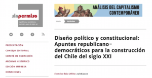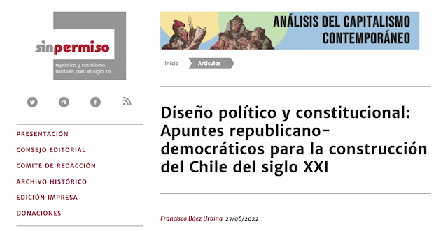 “Diseño político y constitucional: Apuntes republicano-democráticos para la construcción del Chile del siglo XXI”, se titula el artículo que publicó el último número de la revista de divulgación masiva española “Sin Permiso”, elaborado por el Dr. Francisco Báez Urbina, sociólogo y académico de la Facultad de Ciencias Sociales de nuestra casa de estudios.