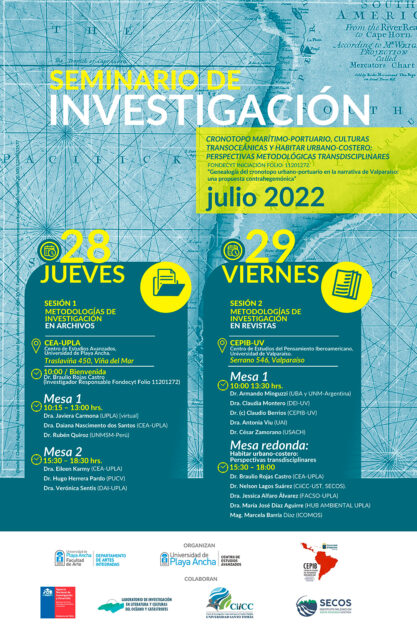 Este 28 y 29 de julio se desarrollará en dependencias de la Universidad de Playa Ancha y de Valparaíso, respectivamente, el seminario de investigación “Cronotopo marítimo-portuario, culturas transoceánicas y habitar urbano-costero: perspectivas metodológicas transdisciplinares”, instancia que tendrá como expositoras (jueves 28 de julio) a las docentes del Departamento de Artes Integradas de la Facultad de Arte UPLA Eileen Karmy Bolton y Verónica Sentis Herrmann.