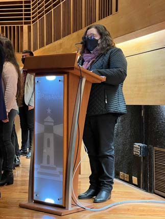 Los 28 estudiantes de la modalidad diurna y 6 de la vespertina, escucharon atentamente las palabras de Directora de la Carrera Giselle Escarpentier Feliú, quien destacó que esta generación ha enfrentado con éxito los problemas y dificultades que les impuso, por ejemplo, la pandemia: “Ustedes son una generación muy especial: fueron la primera generación, después de muchos años, que lograba conformar un Centro de Estudiantes, lo cual marcó un hito a nivel de carrera por el alto nivel de participación de los estudiantes de básica. Por otro lado, vivieron la pandemia 20-21 como estudiantes universitarios, pero también como practicantes en los establecimientos educacionales, lo que implicó ser capaces de reinventarse, aplicar todos los recursos que conocían y aprender nuevas estrategias para alcanzar procesos de aprendizajes efectivos”.