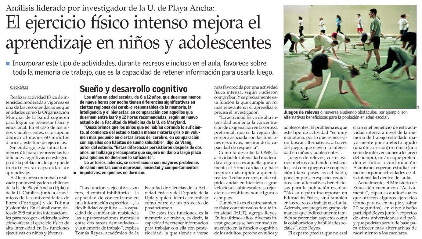 Así lo plantea un trabajo realizado por investigadores chilenos de la U. de Playa Ancha (Upla) y de la U. Católica, junto a académicos de las universidades de Porto (Portugal) y de Tolima (Colombia). En él analizaron datos de 295 estudios internacionales para recoger evidencia sobre cómo afecta el ejercicio físico de alta intensidad en las funciones ejecutivas en niños y jóvenes.