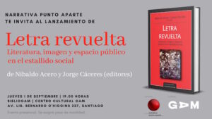 Un conjunto de ensayos escritos por una veintena de autores chilenos que reflexionan sobre las relaciones entre la cultura y los hechos ocurridos durante el 18-O, contiene el libro “Letra revuelta. Literatura, imagen y espacio público en el estallido social”, cuya presentación se realizará el próximo jueves 01 de septiembre, a las 19.00 horas, en el Centro Cultural GAM, en Santiago.
