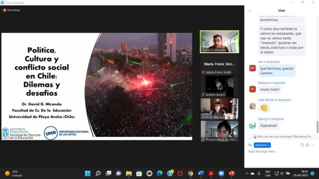 En esa línea de reflexión, el Dr. Miranda presentó en su exposición el tema “Política, Cultura y conflicto social en Chile: Dilemas y desafíos”, abordando cómo la emergencia de movimientos sociales en el Chile de las últimas décadas ha incidido en la conformación de las principales políticas propuestas en educación y cultura en la propuesta de nueva constitución que se plebiscitará el próximo 4 de septiembre en nuestro país, destacando entre estos ámbitos, las demandas estudiantiles, de los feminismos, de los pueblos originarios, y de los grupos históricamente excluidos, como ejes transversales para a la nueva institucionalidad, generando nuevos desafíos en términos de políticas públicas y su relación con los sujetos sociales que serán partícipes de éstas en los escenarios futuros.