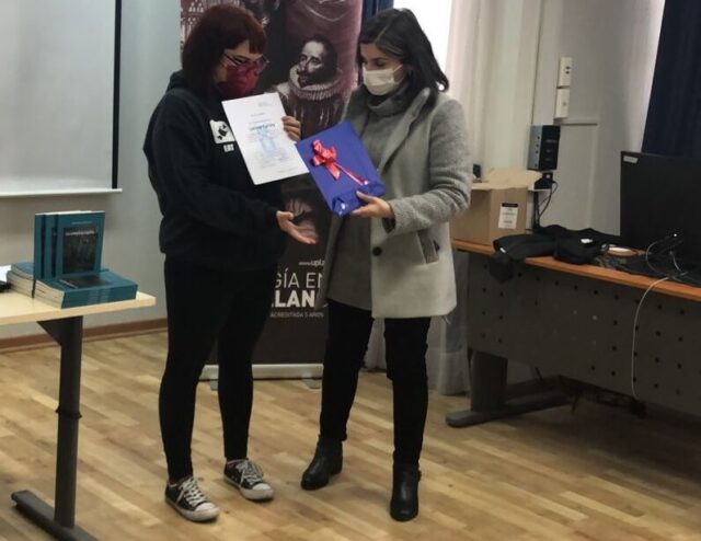 Mención Honrosa: Lorena Carcey, estudiante de Pedagogía en Castellano, con su microcuento titulado “Memento mori”.