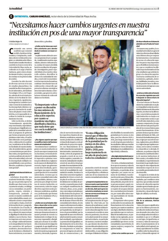 Fuente: entrevista publicada en El Mercurio de Valparaíso, domingo 4 de septiembre de 2022 (acceso para suscriptores). El día anterior, el rector electo Carlos González fue entrevistado en el programa «A fondo», de QuintaVisión, que puede verse en este enlace.