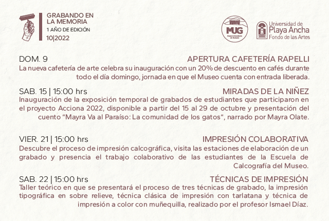 La programación “Grabando en la Memoria: Un año de edición” partirá con la inauguración de la nueva cafetería “Rapelli” el domingo 9, que contará con la apertura de la exposición de pintura “Soberanías de la memoria” de Patricio Bruna Poblete, muestra que estará disponible en la cafetería de arte, también habrá un 20% de descuento en cafés. Asimismo durante todo el domingo, el MUG contará con entrada liberada como parte del beneficio en que cada segundo domingo del mes el Museo te invita a recorrer el arte del grabado.