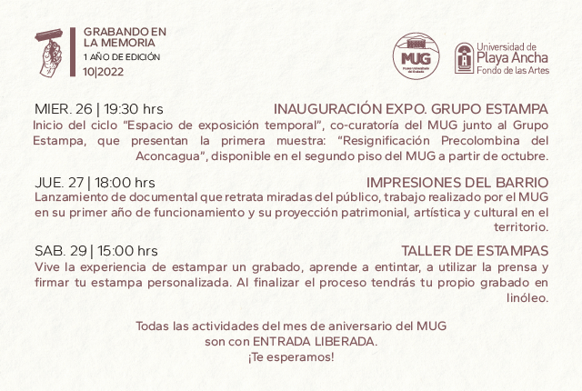 El Museo Universitario del Grabado de la Universidad de Playa Ancha (MUG-UPLA) está de aniversario y como parte de la celebración, ofrece diferentes actividades que contarán con entrada liberada y que se desarrollarán durante octubre, enfocadas en los distintos públicos y áreas de la institución museal.