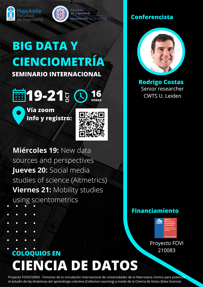 “Big Data y Cienciometría” se denomina el Seminario Internacional que se realizará vía Zoom entre el 19 y 21 de octubre, a las 16 horas, y que es organizado por el Laboratorio de Data Science de la Facultad de Ingeniería y el Magíster en Bibliotecología de la Universidad de Playa Ancha, en conjunto con la Facultad de Ingeniería de la Universidad de La Serena.