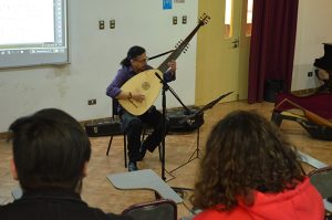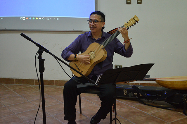 La charla-concierto dada por el músico de la Facultad de Arte fue una mezcla de teoría respecto del origen, características, materialidad y repertorio de cada instrumento, así como de interpretación de temas musicales que dieron cuenta de la versatilidad de la guitarra barroca y la tiorba como instrumentos acompañantes del canto.