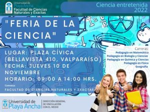 Con el objetivo de difundir en la comunidad el atractivo mundo de las ciencias, la Universidad de Playa Ancha a través de la Facultad de Ciencias Naturales y Exactas, realizará la “Feria de la Ciencia”, el jueves 10 de noviembre, desde las 9°° a las 14°° horas.