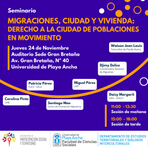 En la tarde (15 a 18 horas), Miguel Pérez abordará «La reemergencia de los campamentos: Ciudadanía y migración en el Gran Santiago»; Watson Jean Louis se referirá a «Sueños cruzados en la toma Altos de Placilla nuevo»; Daisy Margarit hablará sobre «Mujeres, migración y ciudad: cartografías de la movilidad urbana»; y Djimy Delice cerrará con el tema «Racismo y convivencia intercultural. Pensando el derecho a la ciudad».
