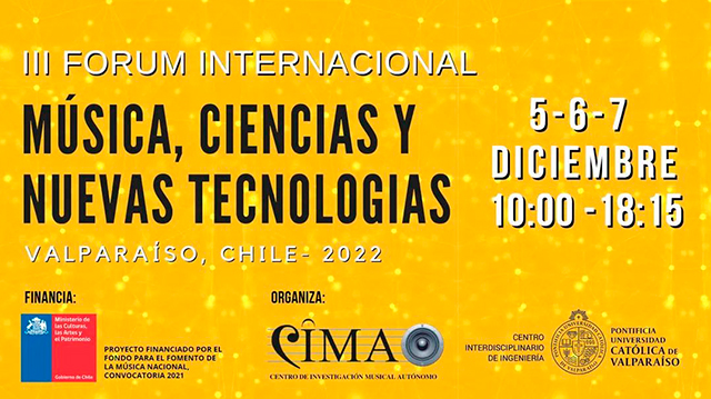 Entre el lunes 5 y miércoles 7 de diciembre se desarrollará en Valparaíso la tercera edición del “Fórum internacional música, ciencias y nuevas tecnologías, Valparaíso 2022”, evento organizado por el Centro de Investigación Musical Autónomo (CIMA) del cual es integrante el académico de la carrera de Pedagogía en Educación Musical de la Facultad de Arte UPLA, Juan Sebastián Cayo.